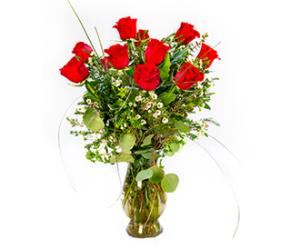 vase, 12 roses, 10 stems mixed greens, white filler ( no baby's breath)