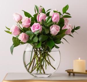 Arrangement of beautiful pink roses and fresh greens in an Allure vase.