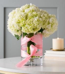 Arrangement of 6 white Hydrangea in a corset tied Illusion vase.