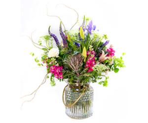 Vase, 3 stem veronica, 3 stem oriental lily, 5 stem stock, 3 stem bupleurum, 2 kale, 3 ranunculus, 3 stem queen anns lace, 3 iris, 4 stem salal, 3 stem eucalyptus,