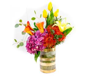 vase, 1 purple hydrangea, 3 mini callas, 3 tulips, 1 oriental lily, 3 pincushion protea, 4 stems eucalyptus