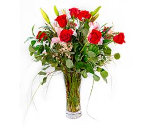 vase, 10 stems mixed greens, 12 roses, 4 oriental lily, 5 stems wax flower