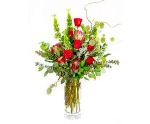 vase, 5 stem bells of Ireland, 6 roses, 4 pink mink protea, 5 stems eucalyptus, 5 stems myrtle, 5 stems curly willow, 4 stems boxwood