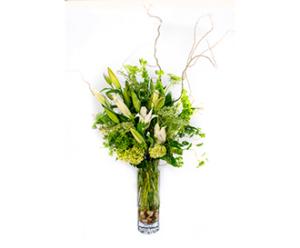 vase, river rock, 5 stem bells of Ireland, 3 stems viburnum, 5 stems oriental lily, 3 stems bupleurum, 4 stems curly willow, 5 stems eucalyptus, 4 stems salal, 3 stems queen anns lace